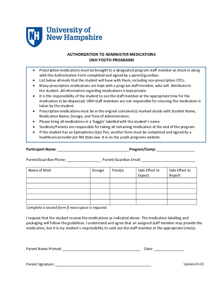 Get the free AUTHORIZATION TO ADMINISTER MEDICATIONS UNH YOUTH ... - ceps unh