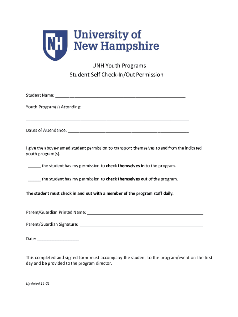 UNH Youth Programs Student Self Checking/Out Permission Student Name: ___ Youth Program(s) Attending: ___ ___ Dates of Attendance: ___I give the above named student permission to transport themselves
