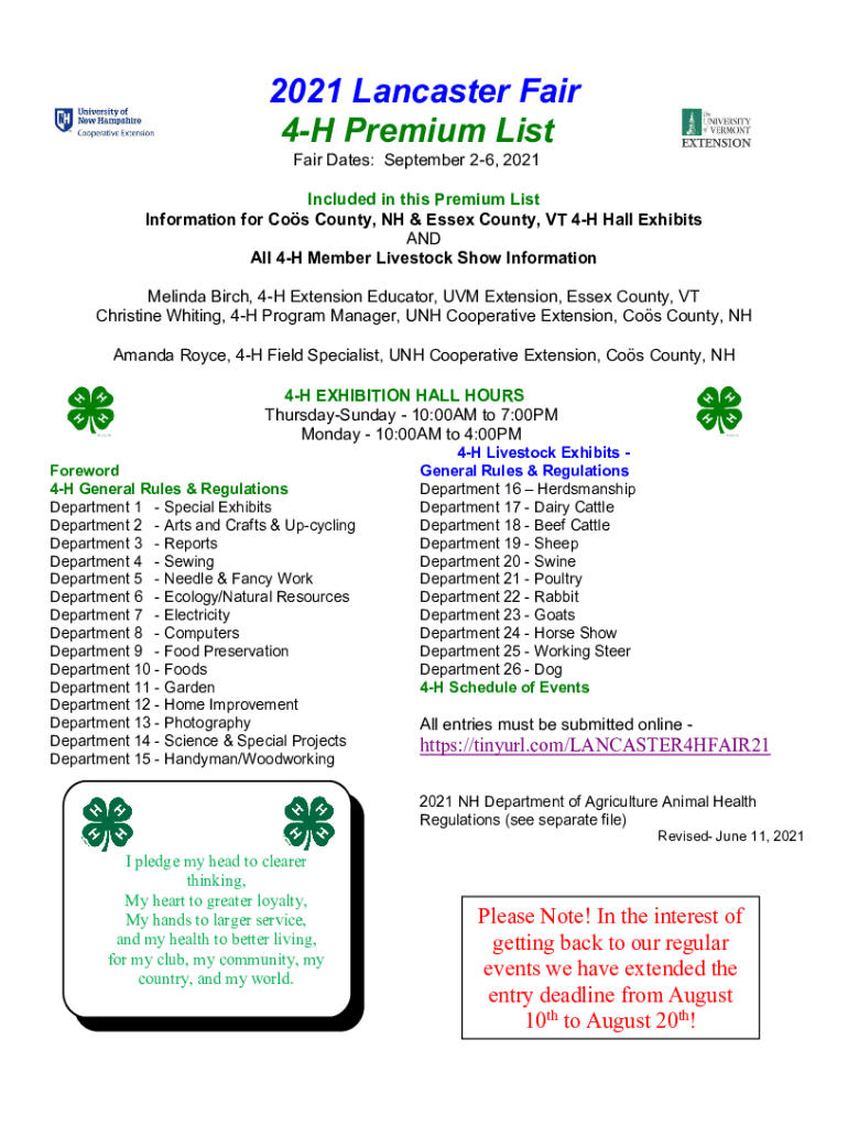 2021 Lancaster Fair 4H Premium List Fair Dates: September 26, 2021Included in this Premium List Information for Cos County, NH & Essex County, VT 4H Hall Exhibits AND All 4H Member Livestock Show