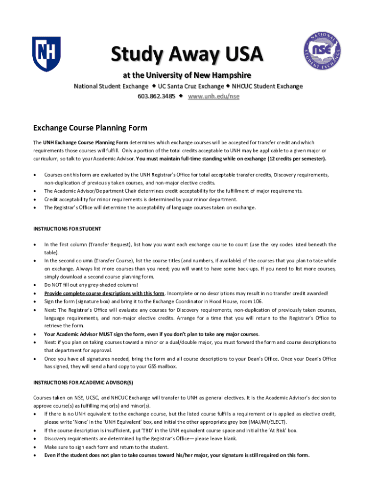 Study Away USA at the University of New Hampshire National Student Exchange UC Santa Cruz Exchange NH CUC Student Exchange 603.862.3485 www.unh.edu/nseExchange Course Planning Form The UNH Exchange
