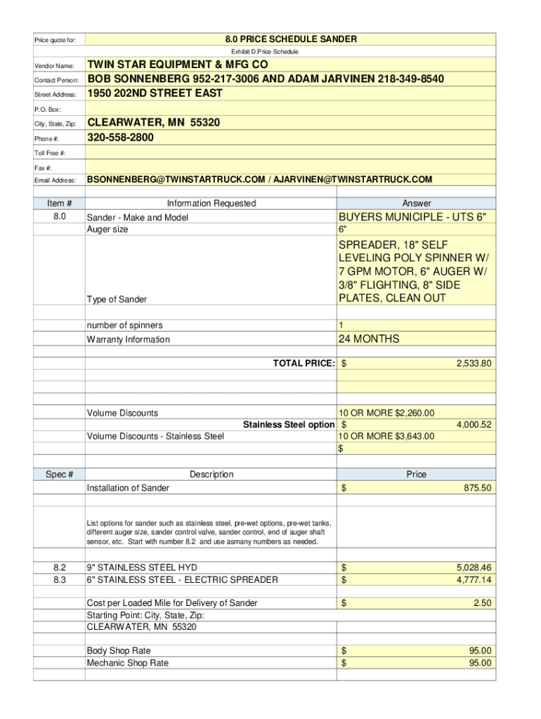 8.0 PRICE SCHEDULE SANDER Price quote for:Exhibit D Price Schedule Vendor Name: Contact Person: Street Address:TWIN STAR EQUIPMENT & MFG CO BOB ROSENBERG 9522173006 AND ADAM MARINE 2183498540 1950