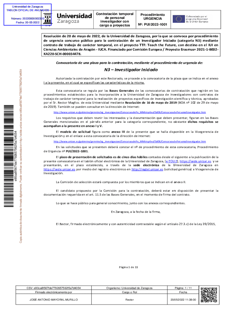 Universidad de Zaragoza TALON OFFICIAL DE Nuncios ontratacin temporal DE person oral investigate or con cargo a pro oyectosNmero: 20220000002320 Tech: 20052022Procedim maintop URGENCY N: PUB/202 221001