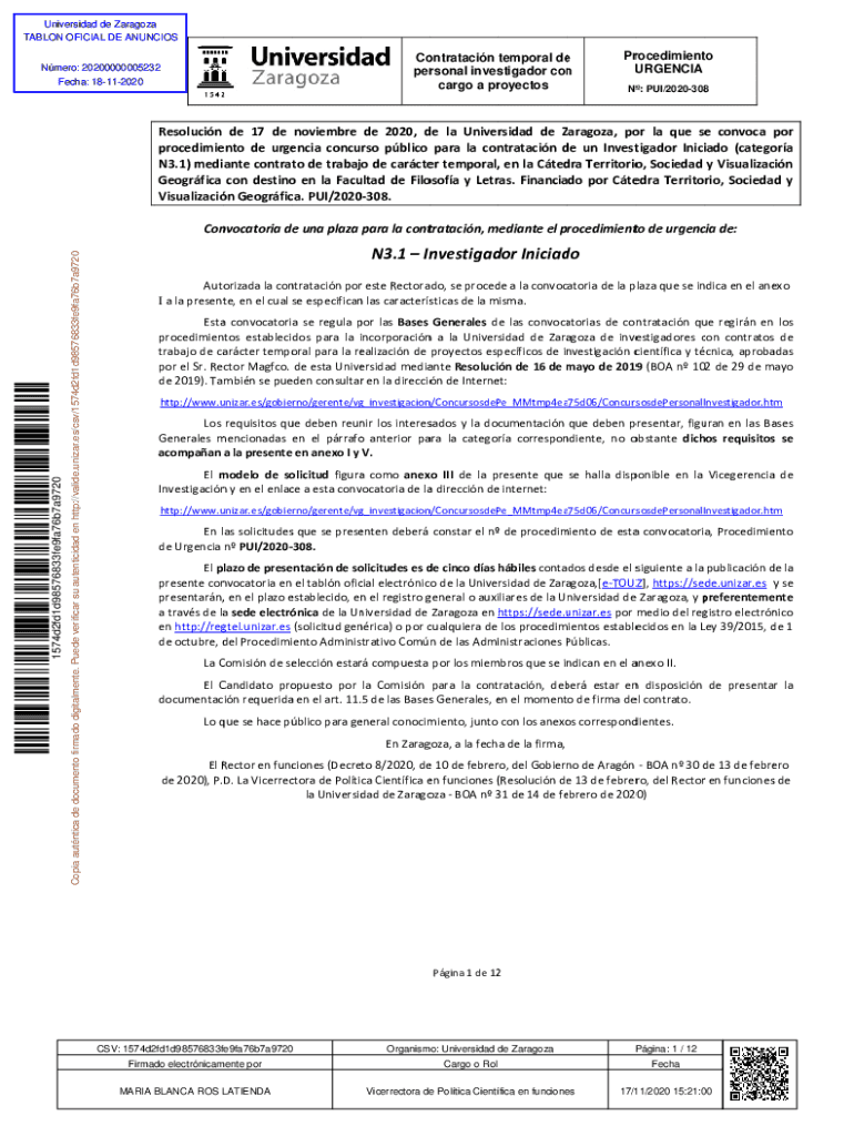 Universidad de Zaragoza TALON OFFICIAL DE Nuncios ontratacin temporal de e personal invest Salvador con n cargo a prroyectosNmero: 20200000005232 Tech: 18112020Prrocedimientto U URGENCY N: PUB/2020308