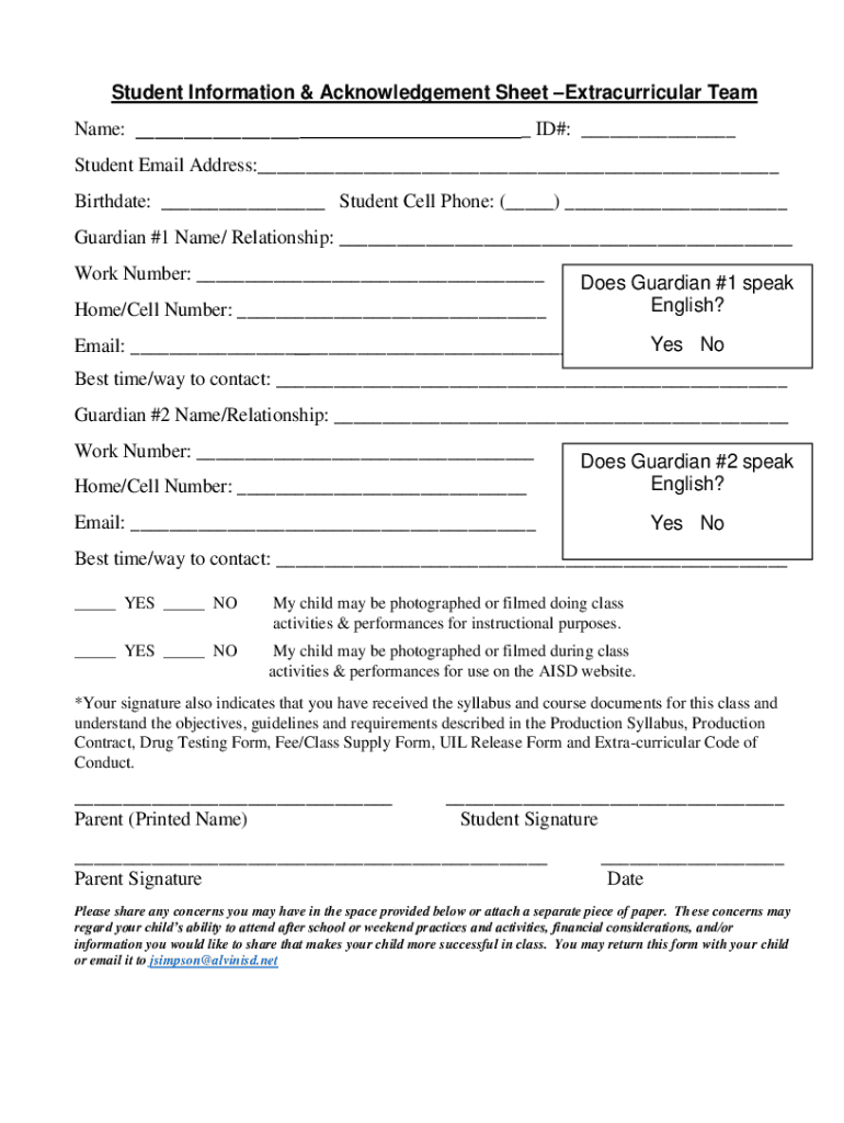 Student Information & Acknowledgement Sheet Extracurricular Team Name: ____ ID#: ___Student Email Address:___ Birthdate: ___ Student Cell Phone: (___) ___ Guardian #1 Name/ Relationship: ___ Work