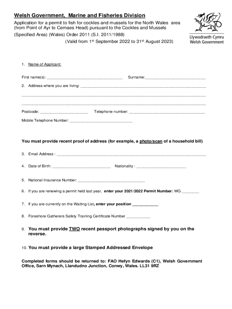 Welsh Government, Marine and Fisheries Division Application for a permit to fish for cockles and mussels for the North Wales area (from Point of AYR to Females Head) pursuant to the Cockles and Mussels