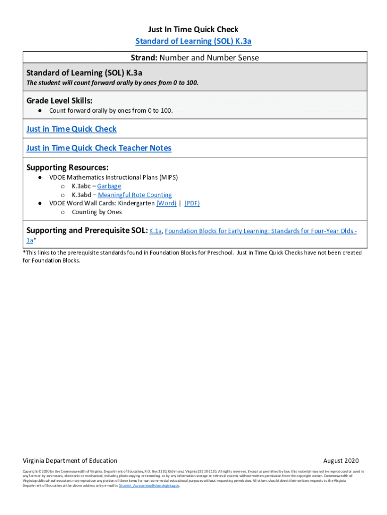 Just In Time Quick Check Standard of Learning (SOL) K.3a Strand: Number and Number Sense Standard of Learning (SOL) K.3a The student will count forward orally by ones from 0 to 100. Grade Level Skills: