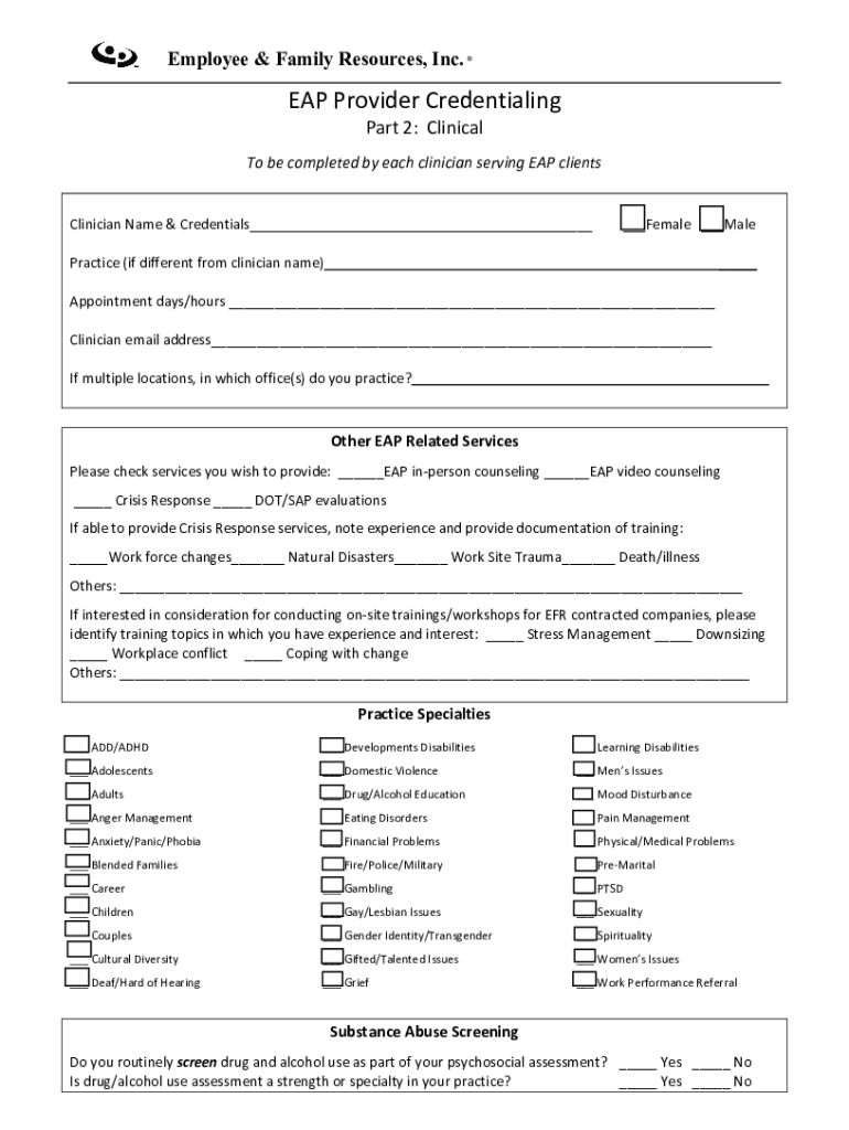 Employee & Family Resources, Inc.EAP Provider Credentialing Part 2: Clinical be completed by each clinician serving EAP clients Clinician Name & Credentials______Female ___Malpractice (if different