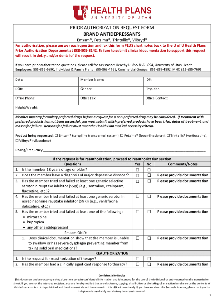 PRIORAUTHORIZATIONREQUESTFORM BRANDANTIDEPRESSANTS ENSAM, IntelliJ, For authorization, pleaseanswereachquestionandfaxthisformPLUSchartnotesbacktotheUofUHealthPlans PriorAuthorizationDepartmentat8885098142.
