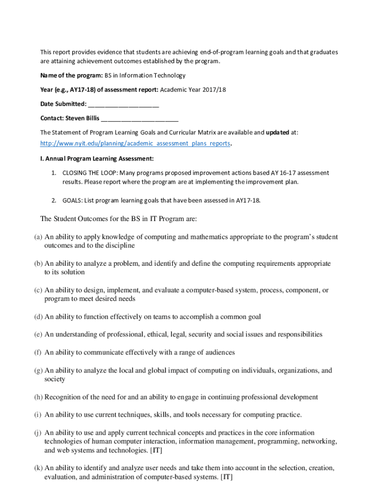 This report provides evidence that students are achieving endofprogram learning goals and that graduates are attaining achievement outcomes established by the program. Name of the program: BS in Information