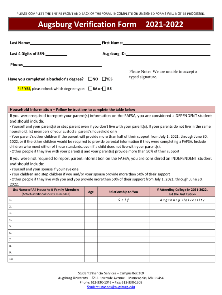 PLEASE COMPLETE THE ENTIRE FRONT AND BACK OF THE FORM. INCOMPLETE OR UNSIGNED FORMS WILL NOT BE PROCESSED. Augsburg Verification Form Last Name:First Name:Last 4 Digits of SSN:Augsburg ID:20212022Phone: