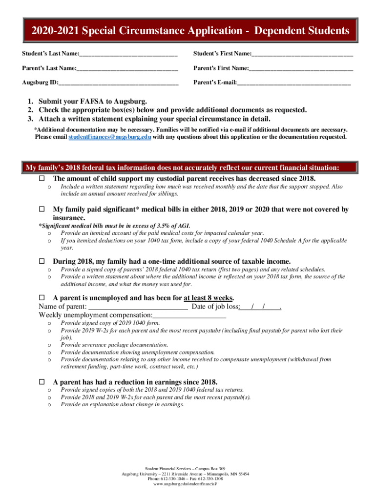 20202021 Special Circumstance Application Dependent Students Last Name:___Students First Name:___Parents Last Name:___Parents First Name:___Augsburg ID:___Parents Email:___1. Submit your FAFSA to