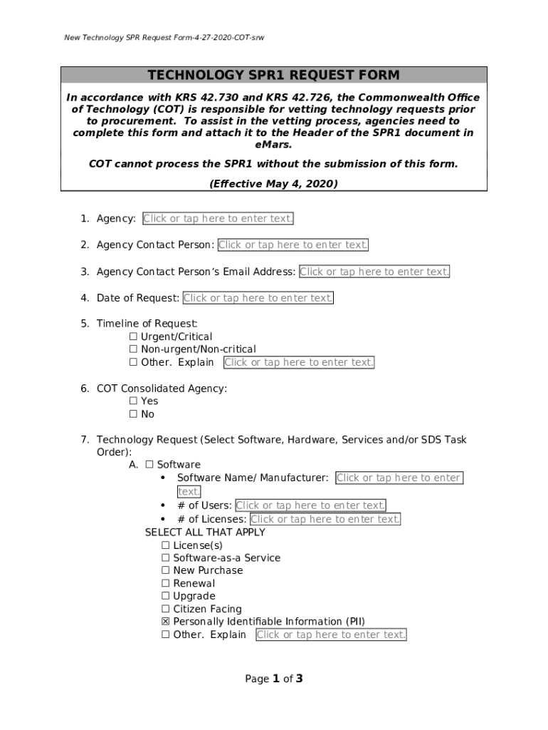What is New Technology SPR1 Request - Effective 5-4-2020-Unrestricted - finance ky Form?