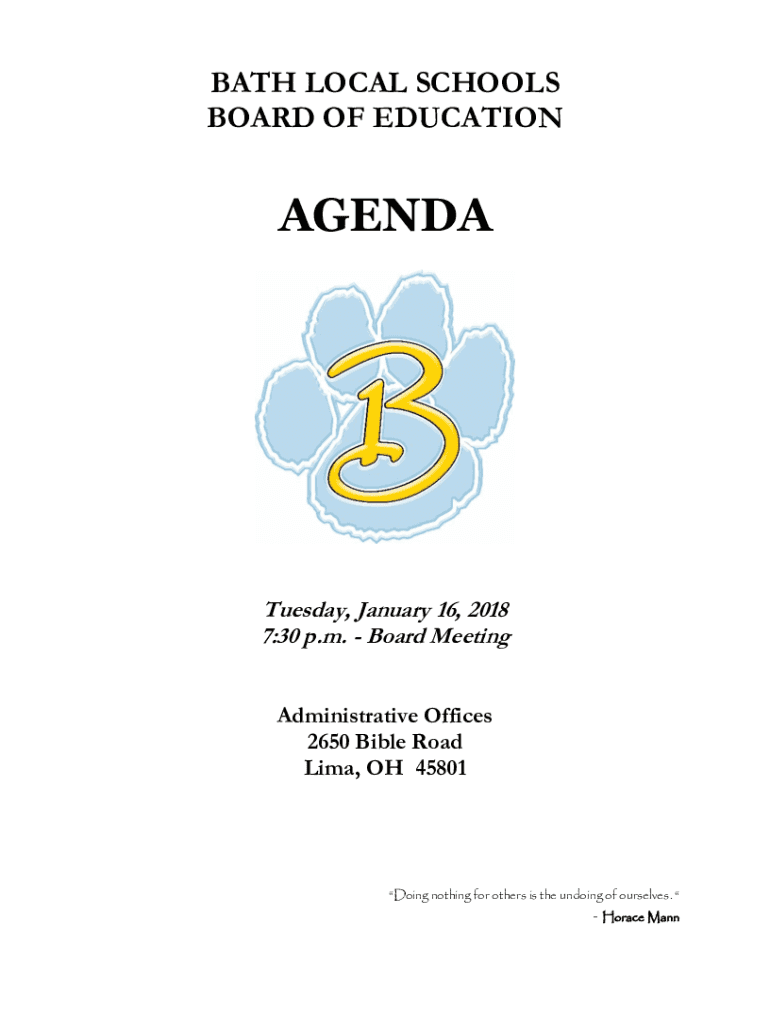 BATH LOCAL SCHOOLS BOARD OF EDUCATIONAGENDATuesday, January 16, 2018 7:30 p.m. Board Meeting Administrative Offices 2650 Bible Road Lima, OH 45801Doing nothing for others is the undoing of ourselves.