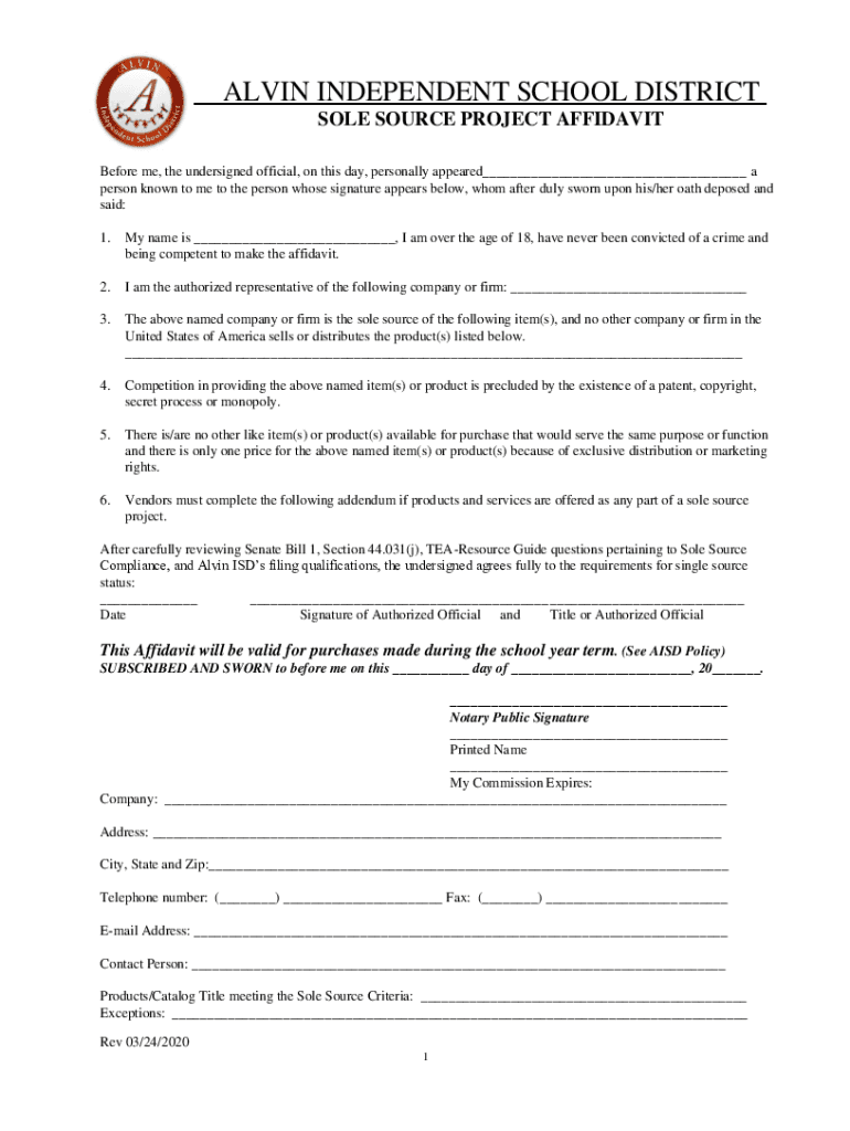 ALVIN INDEPENDENT SCHOOL DISTRICT SOLE SOURCE PROJECT AFFIDAVIT Before me, the undersigned official, on this day, personally appeared___ a person known to me to the person whose signature appears