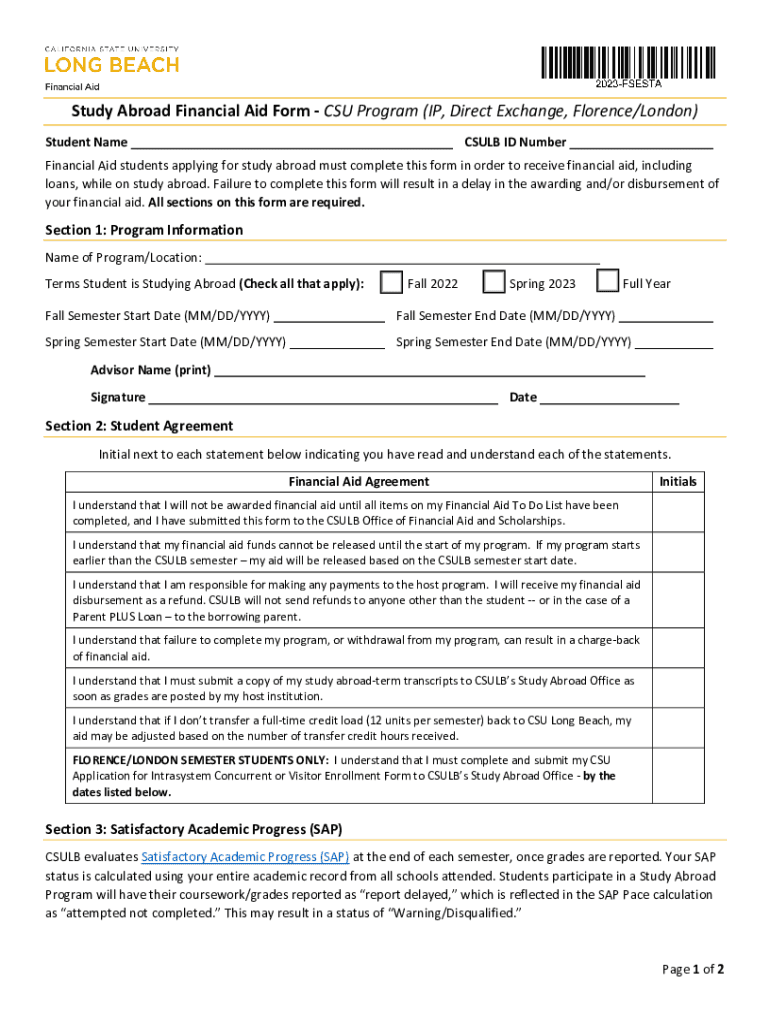 Study Abroad Financial Aid Form CSU Program (IP, Direct Exchange, Florence/London) Student NameCSULB ID NumberFinancial Aid students applying for study abroad must complete this form in order to receive