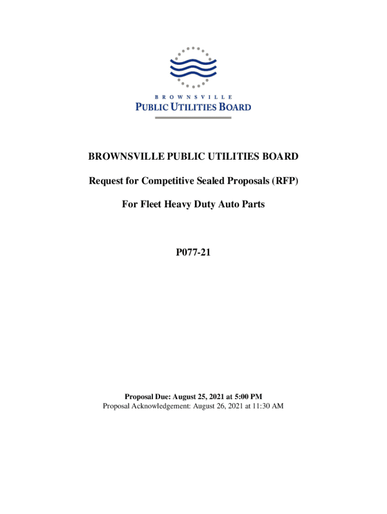 BROWNSVILLE PUBLIC UTILITIES BOARD Request for Competitive Sealed Proposals (RFP) For Fleet Heavy Duty Auto PartsP07721Proposal Due: August 25, 2021, at 5:00 PM Proposal Acknowledgement: August 26,
