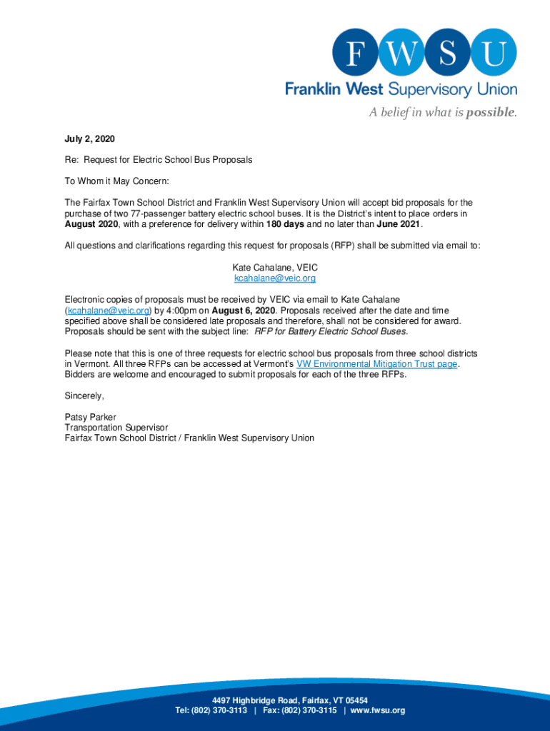 A belief in what is possible. July 2, 2020, Re: Request for Electric School Bus Proposals To Whom it May Concern: The Fairfax Town School District and Franklin West Supervisory Union will accept bid