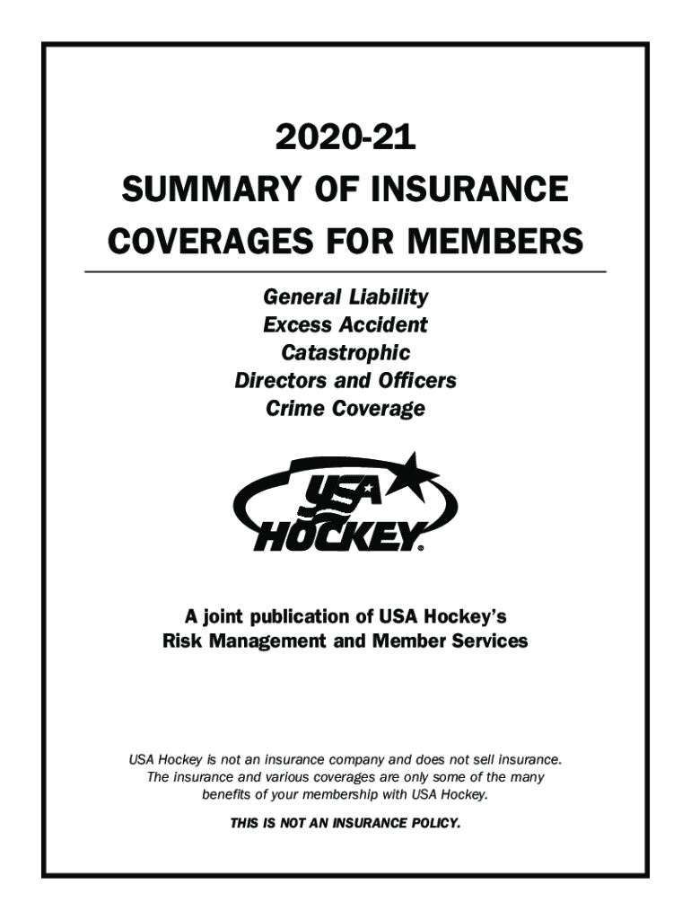 202021 SUMMARY OF INSURANCE COVERAGES FOR MEMBERS General Liability Excess Accident Catastrophic Directors and Officers Crime Coverage joint publication of USA Hockey Risk Management and Member Services