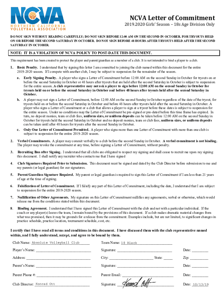 NCAA Letter of Commitment2019.2020 Girls Season 18s Age Division Only DO NOT SIGN WITHOUT READING CAREFULLY; DO NOT SIGN BEFORE 12:00 AM ON THE SECOND IN OCTOBER. FOR TRYOUTS HELD ON OR BEFORE THE