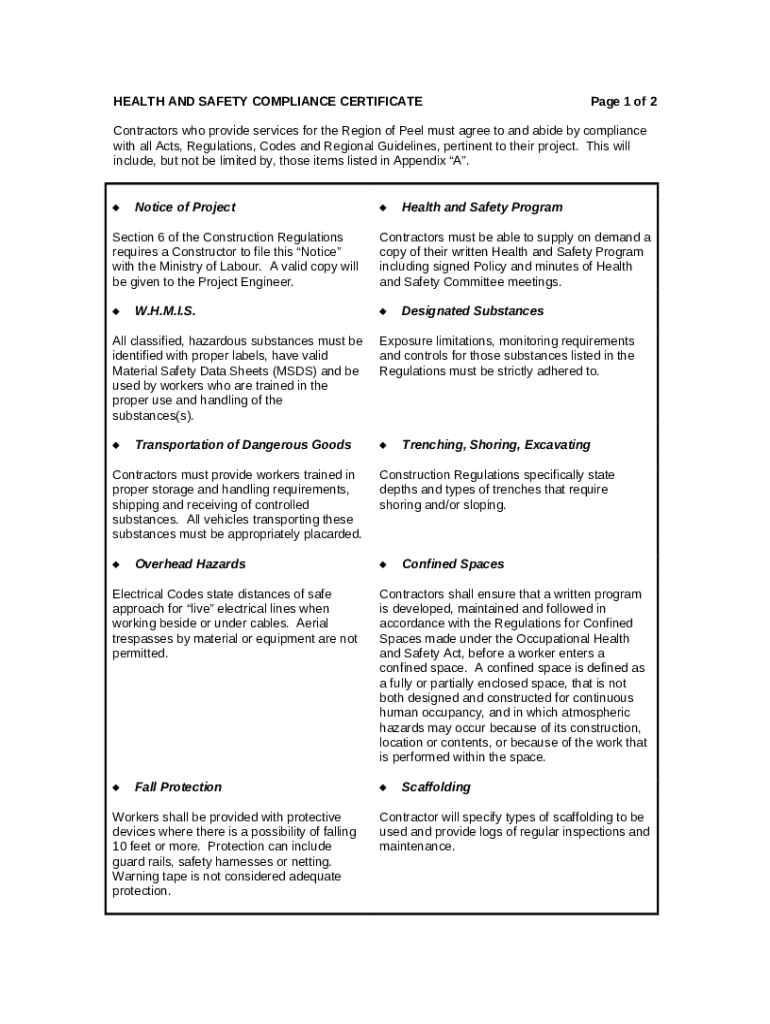 HEALTH AND SAFETY COMPLIANCE CERTIFICATE - Peel Region template instructions