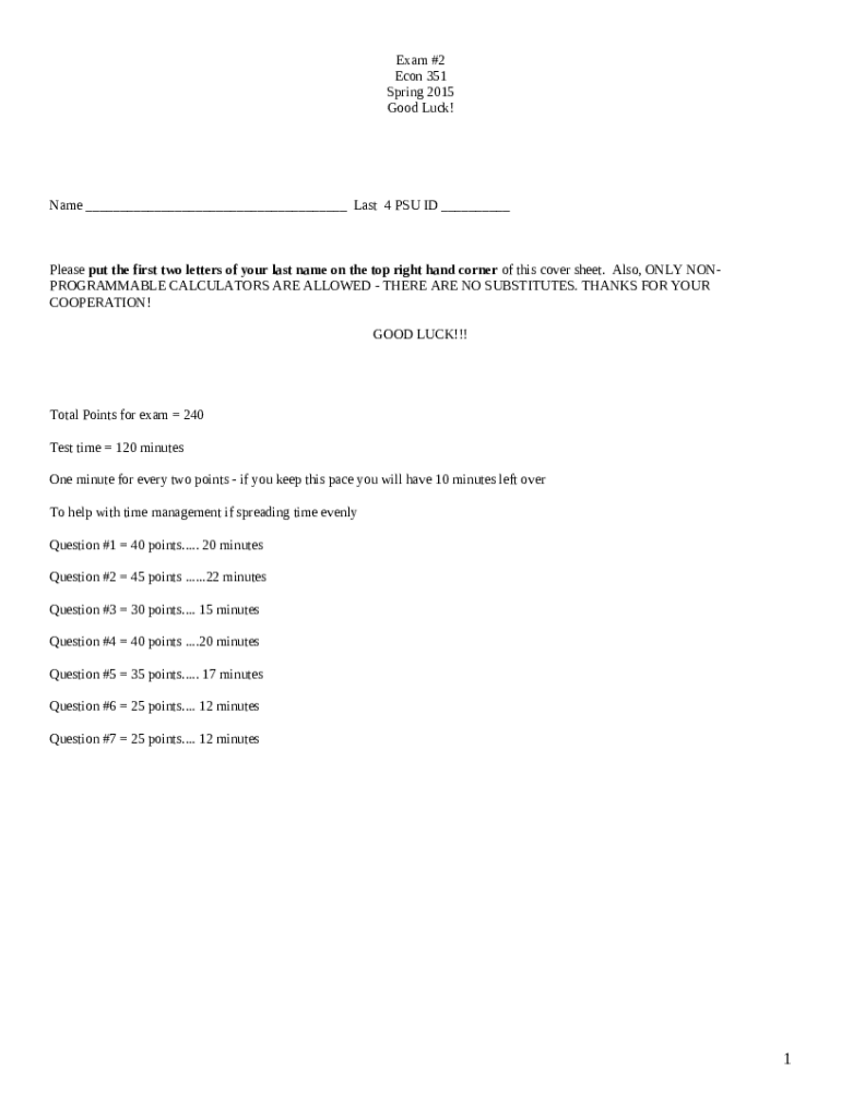 Frequently asked questions about the form Exam 2 ECON 351 fall 2014 - Exam #2 Econ 351 Fall 2014 Good Luck! Name ...