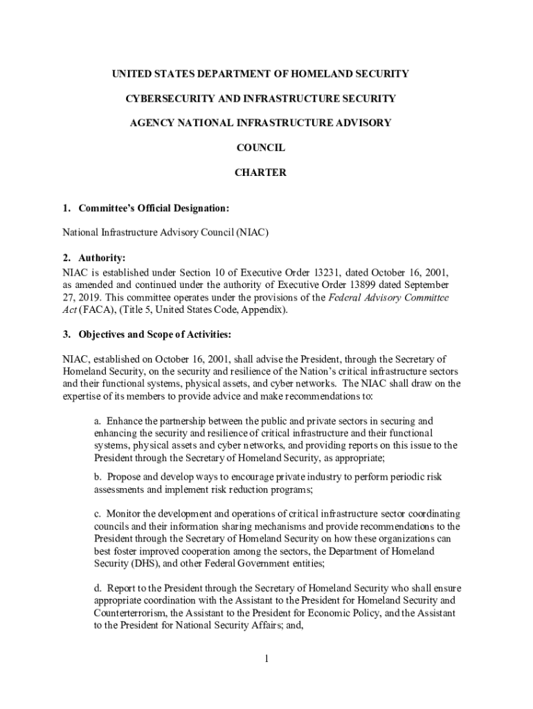 UNITED STATES DEPARTMENT OF HOMELAND SECURITY CYBERSECURITY AND INFRASTRUCTURE SECURITY AGENCY NATIONAL INFRASTRUCTURE ADVISORY COUNCIL CHARTER 1. Committees Official Designation: National Infrastructure