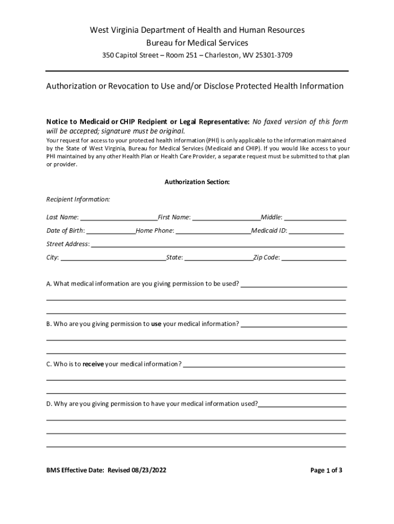 West Virginia Department of Health and Human Resources Bureau for Medical Services 350 Capitol Street Room 251 Charleston, WV 253013709Authorization or Revocation to Use and/or Disclose Protected