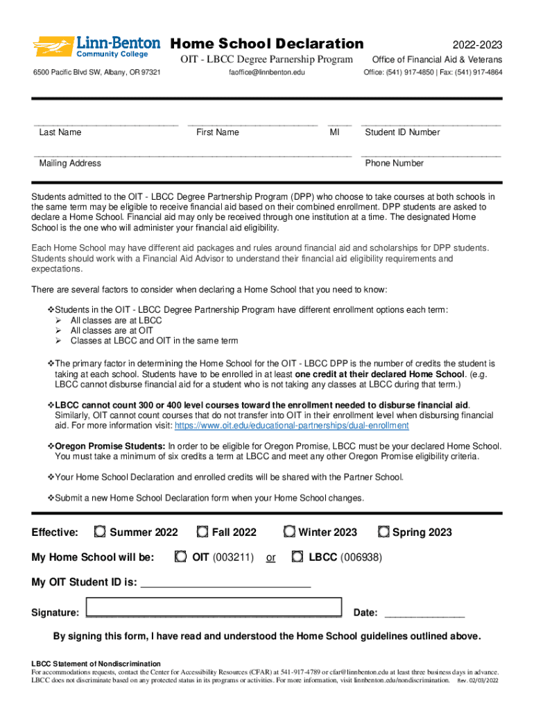 Home School Declaration20222023OIT LBC Degree Partnership Program 6500 Pacific Blvd SW, Albany, OR 97321___ Last NameOffice of Financial Aid & Veteransfaoffice@linnbenton.eduOffice: (541) 9174850