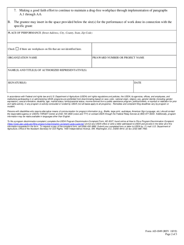 This form is available electronically. OMB Control No. 05050027 Expiration Date: 04/30/2022Certification Regarding Degree Workplace Requirements (Grants) Alternative I For Grantees Other Than IndividualsAD1049The