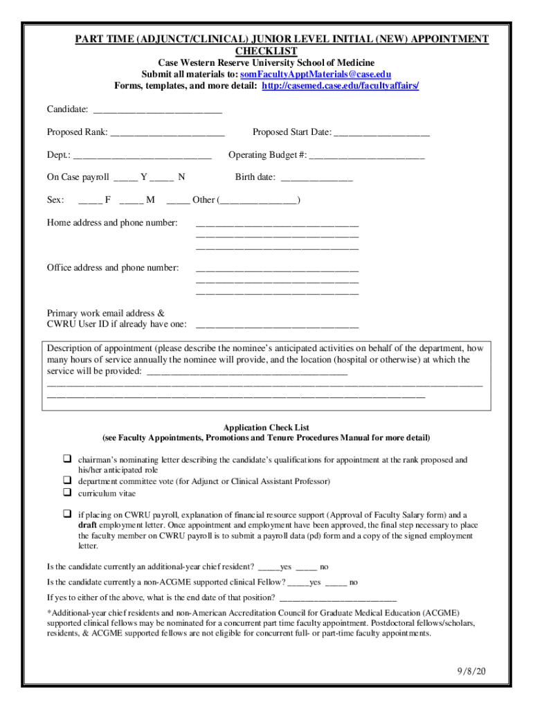 PART TIME (ADJUNCT/CLINICAL) JUNIOR LEVEL INITIAL (NEW) APPOINTMENT CHECKLIST Case Western Reserve University School of Medicine Submit all materials to: somFacultyApptMaterials@case.edu Forms, templates,