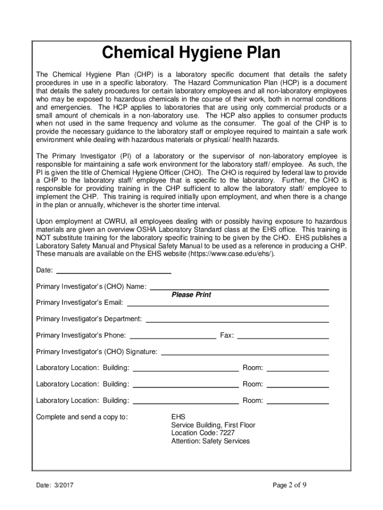 Case Western Reserve University Chemical Hygiene Plan The Chemical Hygiene Plan applies to your laboratory only if you meet All the following criteria: (i) Chemical manipulations are carried out on