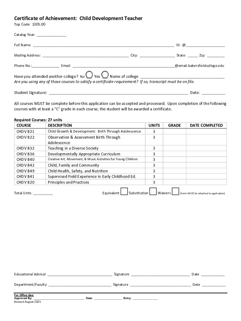 Certificate of Achievement: Child Development Teacher Top Code: 1305.00Catalog Year: ___ Full Name: ___ ID: @___ Mailing Address: ___ City: ___ State: ___ Zip: ___ Phone No.:___ Email: ___@email.bakersfieldcollege.eduHave