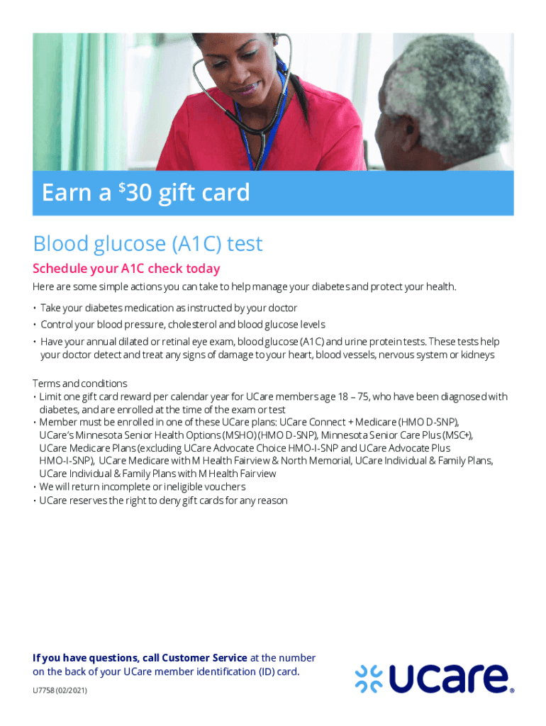 Earn a $30 gift card Blood glucose (A1C) test Schedule your A1C check today Here are some simple actions you can take to help manage your diabetes and protect your health. Take your diabetes medication