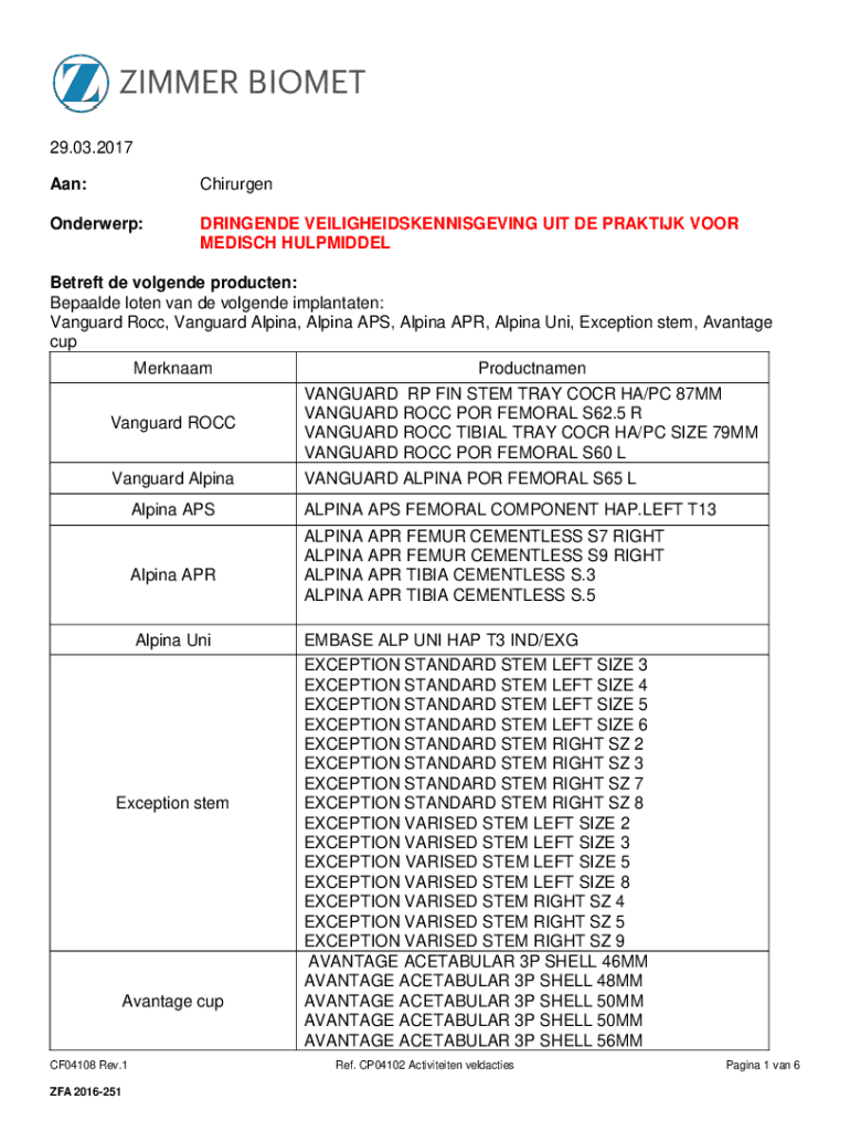 29.03.2017 AAN:ChirurgenOnderwerp:FRINGED VEILIGHEIDSKENNISGEVING UIT DE PRACTICE POOR MEDICI HULPMIDDELBetreft de violence producten: Repealed Loren van DE violence implantation: Vanguard Rock, Vanguard
