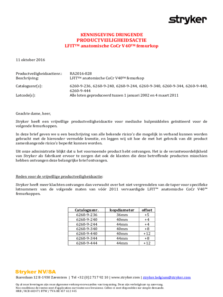 Get the free Stryker NV/SA PRODUCTVEILIGHEIDSACTIE - FAGG
