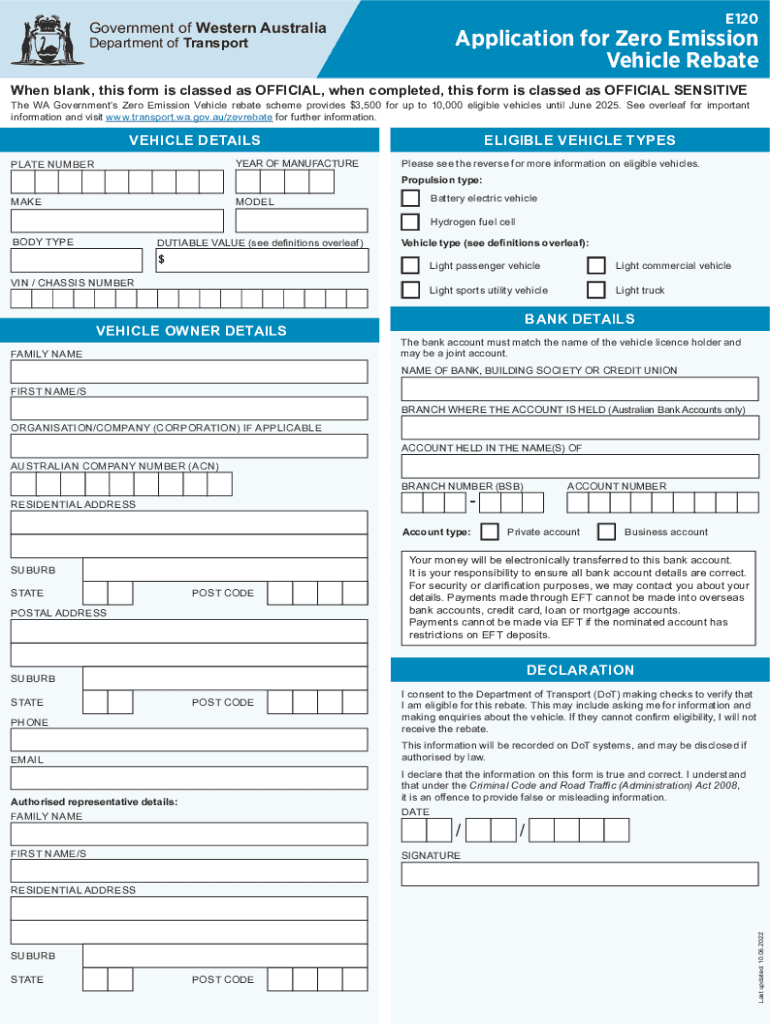 E120Government of Western AustraliaApplication for Zero Emission Vehicle RebateDepartment of Transported blank, this form is classed as OFFICIAL, when completed, this form is classed as OFFICIAL Sensitive