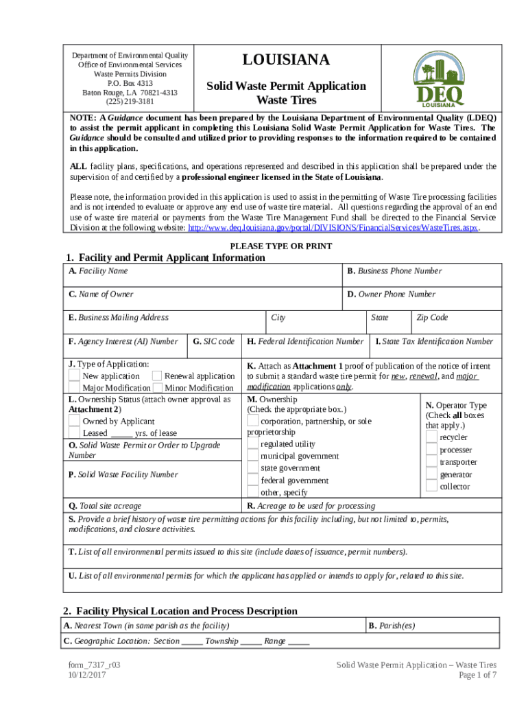 Instructions for the form NOTE: A Guidance document has been prepared by the Louisiana Department of Environmental Quality (LDEQ) to assist the permit applicant in completing this Louisiana Solid Waste Permit Application for Waste Tires - deq louisiana