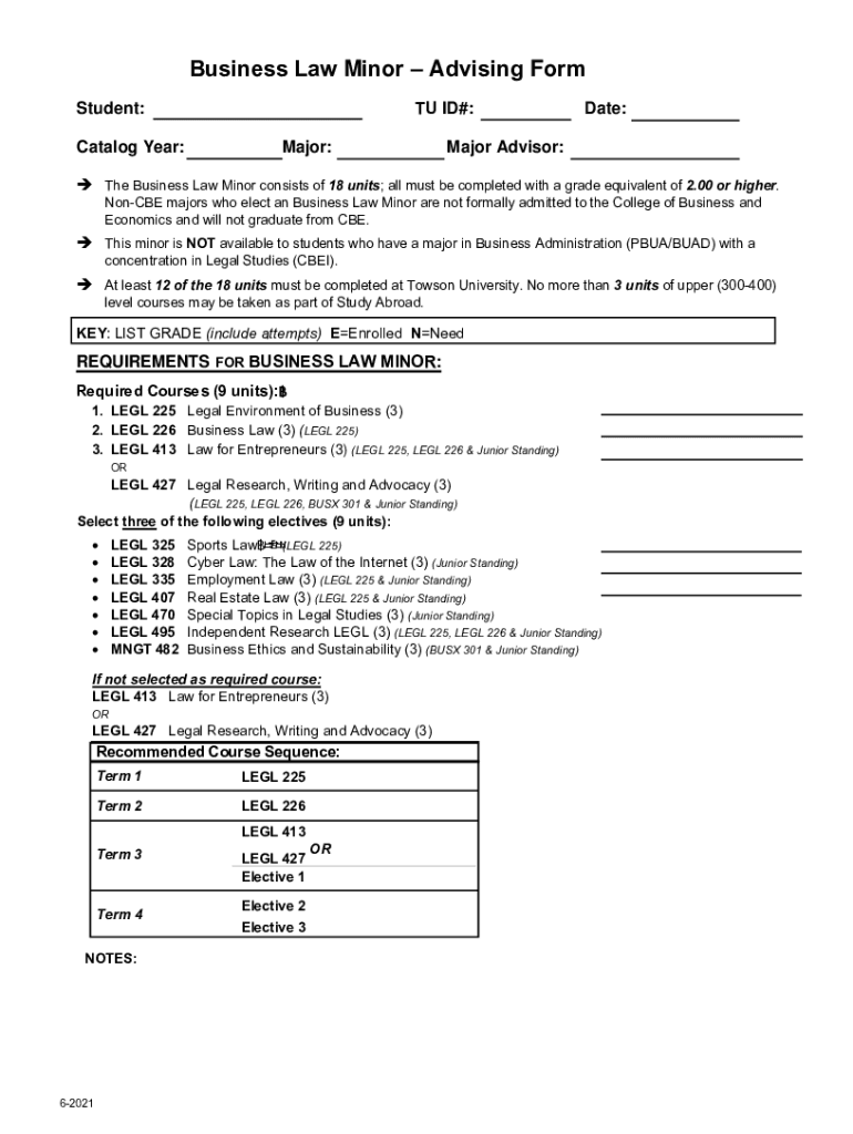 Business Law Minor Advising Form TU ID#:Student: Catalog Year:Major:Date:Major Advisor: The Business Law Minor consists of 18 units; all must be completed with a grade equivalent of 2.00 or higher.