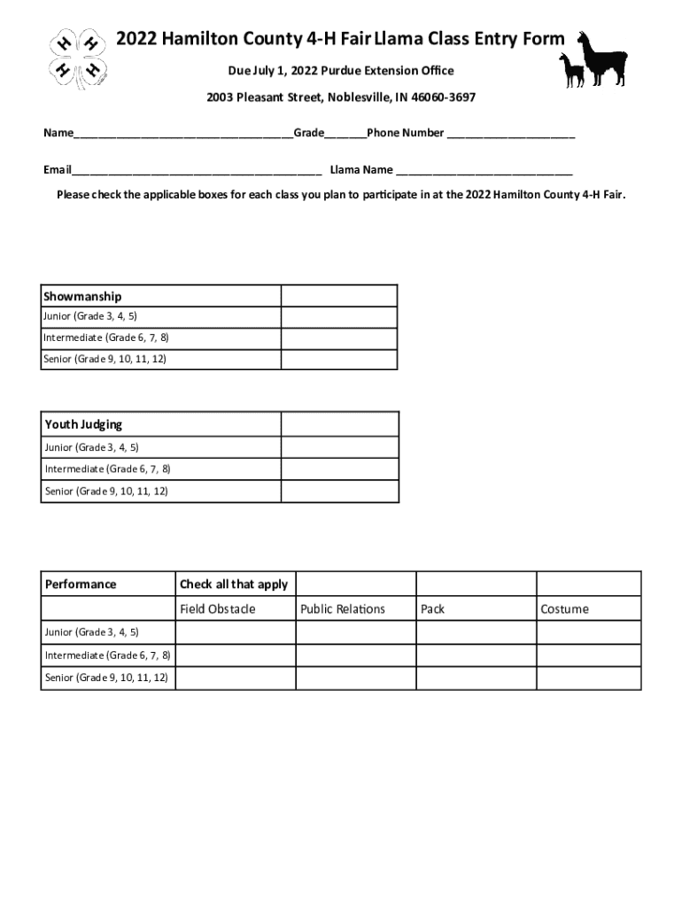 2022 Hamilton County 4H Fair Llama Class Entry Form Due July 1, 2022, Purdue Extension Office 2003 Pleasant Street, Noblesville, IN 460603697 Name___Grade___Phone Number ___ Email___ Llama Name ___