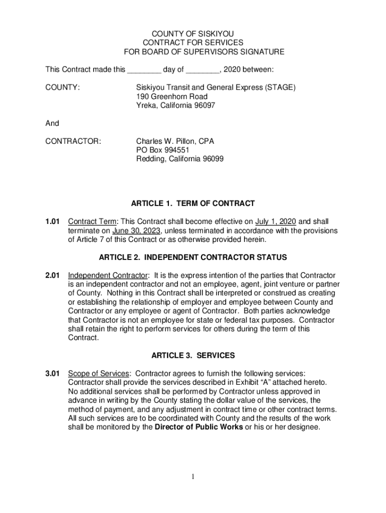 COUNTY OF MISKITO CONTRACT FOR SERVICES FOR BOARD OF SUPERVISORS SIGNATURE This Contract made this ___ day of ___, 2020 between: COUNTY:Miskito Transit and General Express (STAGE) 190 Greenhorn Road