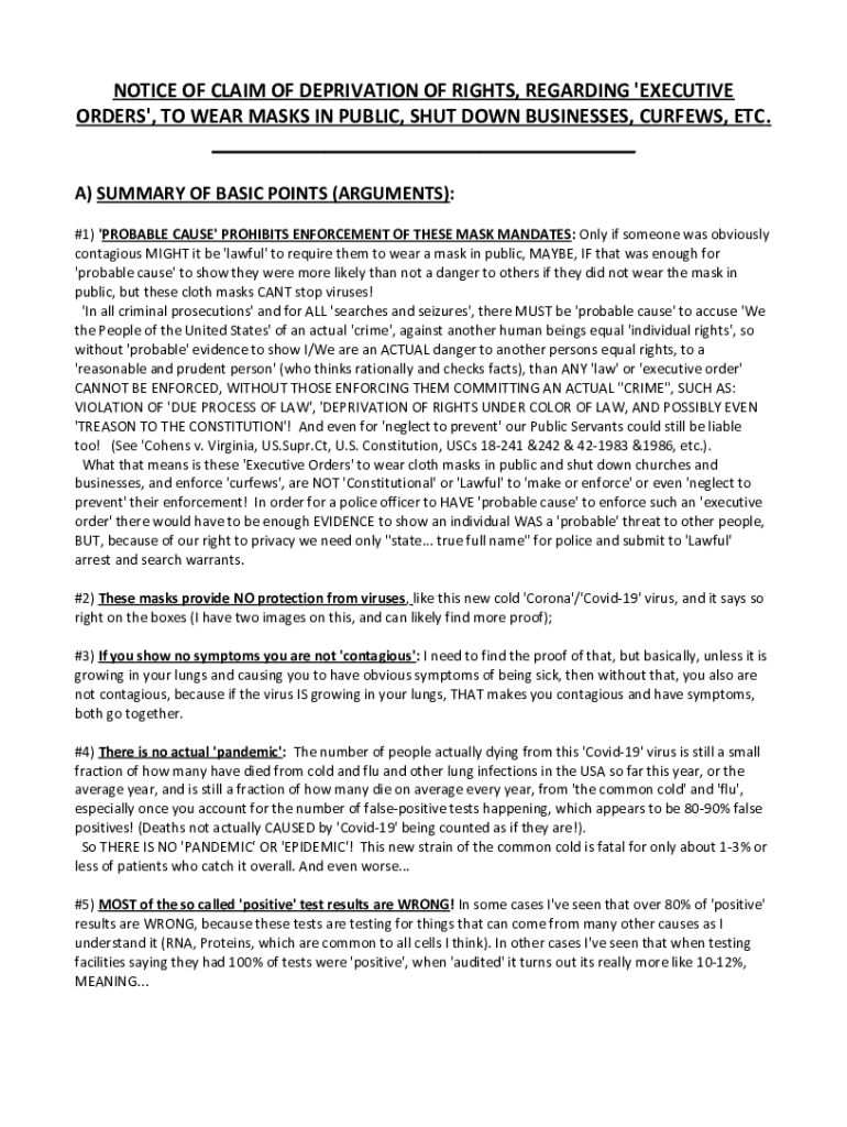 NOTICE OF CLAIM OF DEPRIVATION OF RIGHTS, REGARDING \'EXECUTIVE ORDERS\', TO WEAR MASKS IN PUBLIC, SHUT DOWN BUSINESSES, CURFEWS, ETC. ___ A) SUMMARY OF BASIC POINTS (ARGUMENTS): #1) \'PROBABLE CAUSE\'