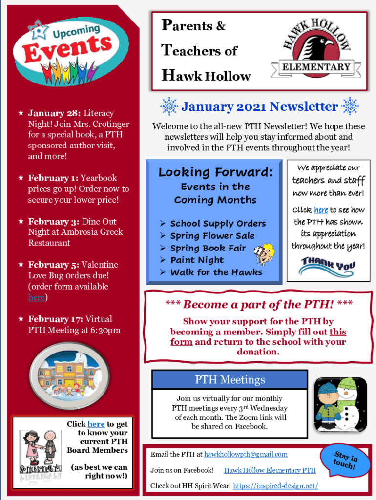 Parents & Teachers of Hawk Hollow January 28: Literacy Night! Join Mrs. Schrödinger for a special book, a PTH sponsored author visit, and more! February 1: Yearbook prices go up! Order now to secure