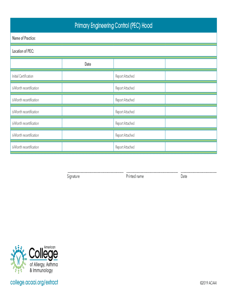 Primary Engineering Control (PEC) Hood Name of Practice: Location of PEC: Date Initial CertificationReport Attached6Month recertificationReport Attached6Month recertificationReport Attached6Month