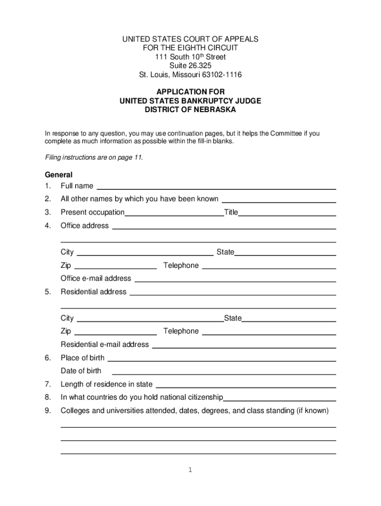 UNITED STATES COURT OF APPEALS FOR THE EIGHTH CIRCUIT 111 South 10th Street Suite 26.325 St. Louis, Missouri 631021116 APPLICATION FOR UNITED STATES BANKRUPTCY JUDGE DISTRICT OF NEBRASKA In response