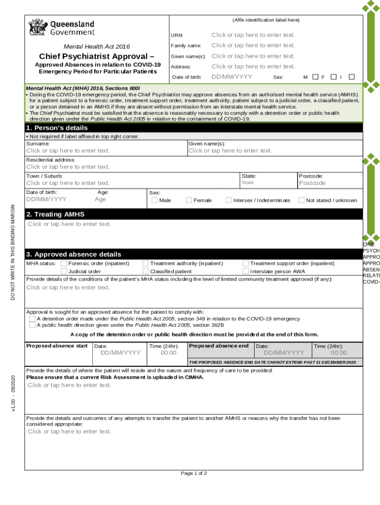 What is Chief Psychiatrist ApprovalApproved Absences in relation to COVID-19 Emergency Period for Particular Patients. Mental Health Act 2016 - Chief Psychiatrist ApprovalApproved Absences in relation to COVID-19 Emergency Period for Particular Pati Form?