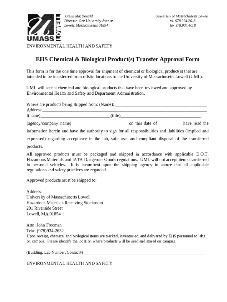 What is EHS Chemical & Biological Product(s) Transfer Approval - UMass Lowell Form?