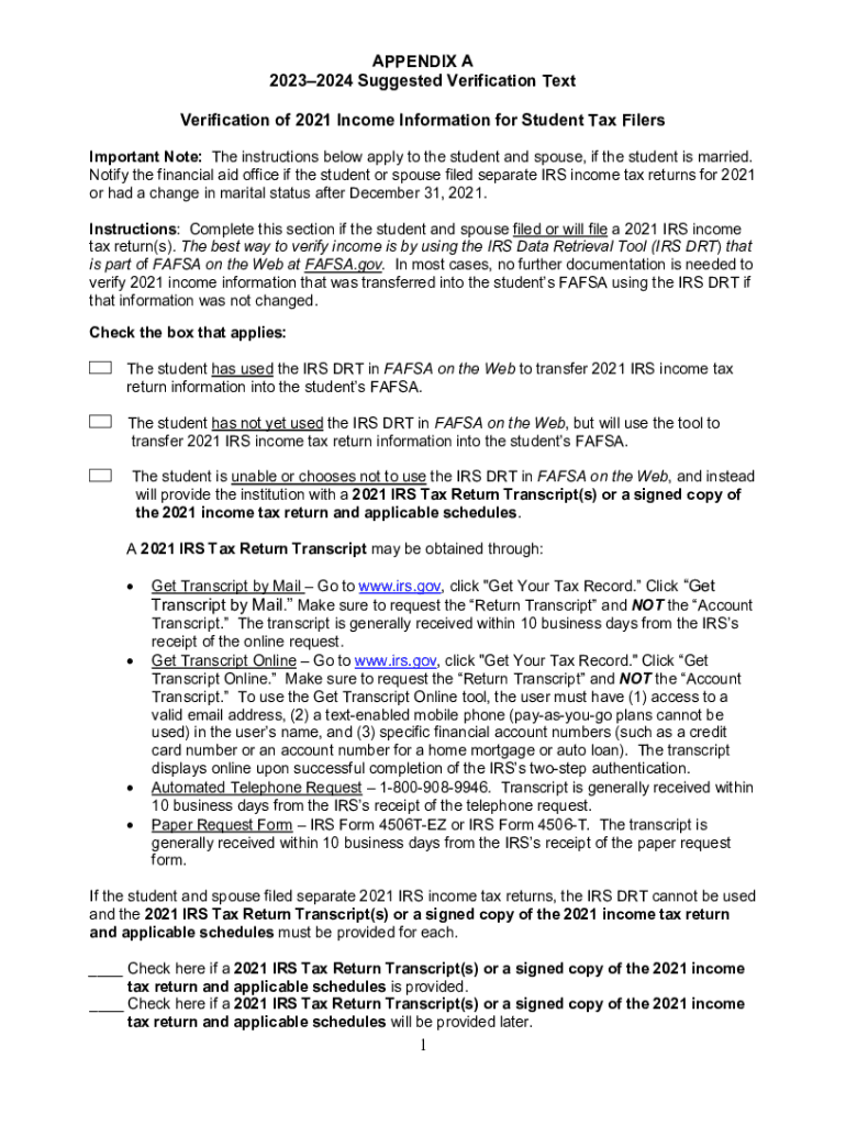 APPENDIX A 20232024 Suggested Verification Text Verification of 2021 Income Information for Student Tax Filers Important Note: The instructions below apply to the student and spouse, if the student