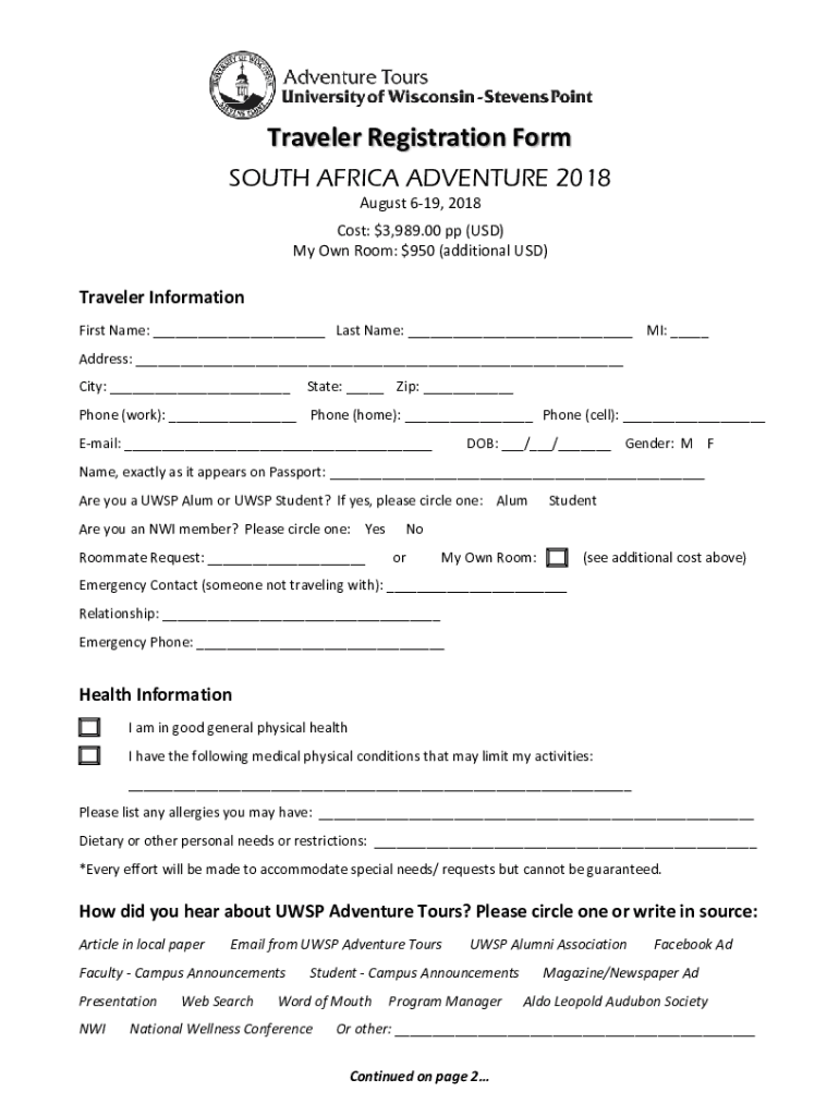 Get the free Traveler Registration Form - University of WisconsinStevens Point
