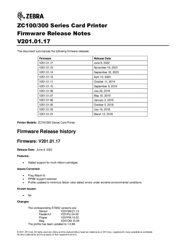 ZC100/300 Series Card Printer Firmware Release Notes V201.01.17 This document summarizes the following firmware releases: FirmwareRelease DateV201.01.17June 8, 2022V201.01.15November 19, 2021V201.01.14September
