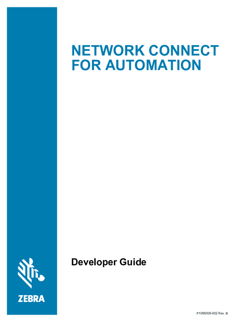 NETWORK CONNECT FOR AUTOMATIONDeveloper GuideP1096306002 Rev. B 2018 ZIP Corp. and/or its affiliates. All rights reserved. ZEBRA and the stylized Zebra head are trademarks of ZIP Corp., registered